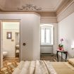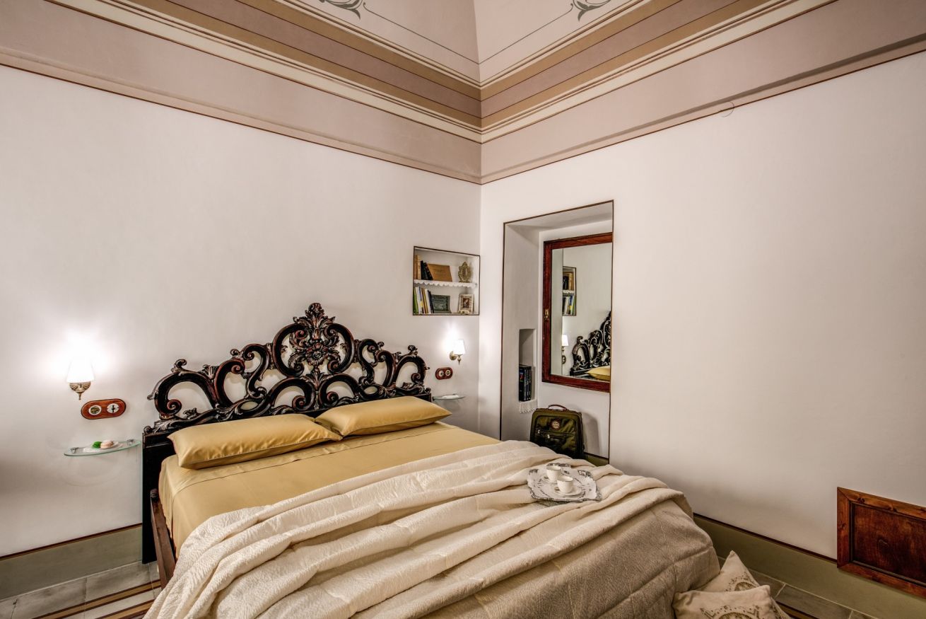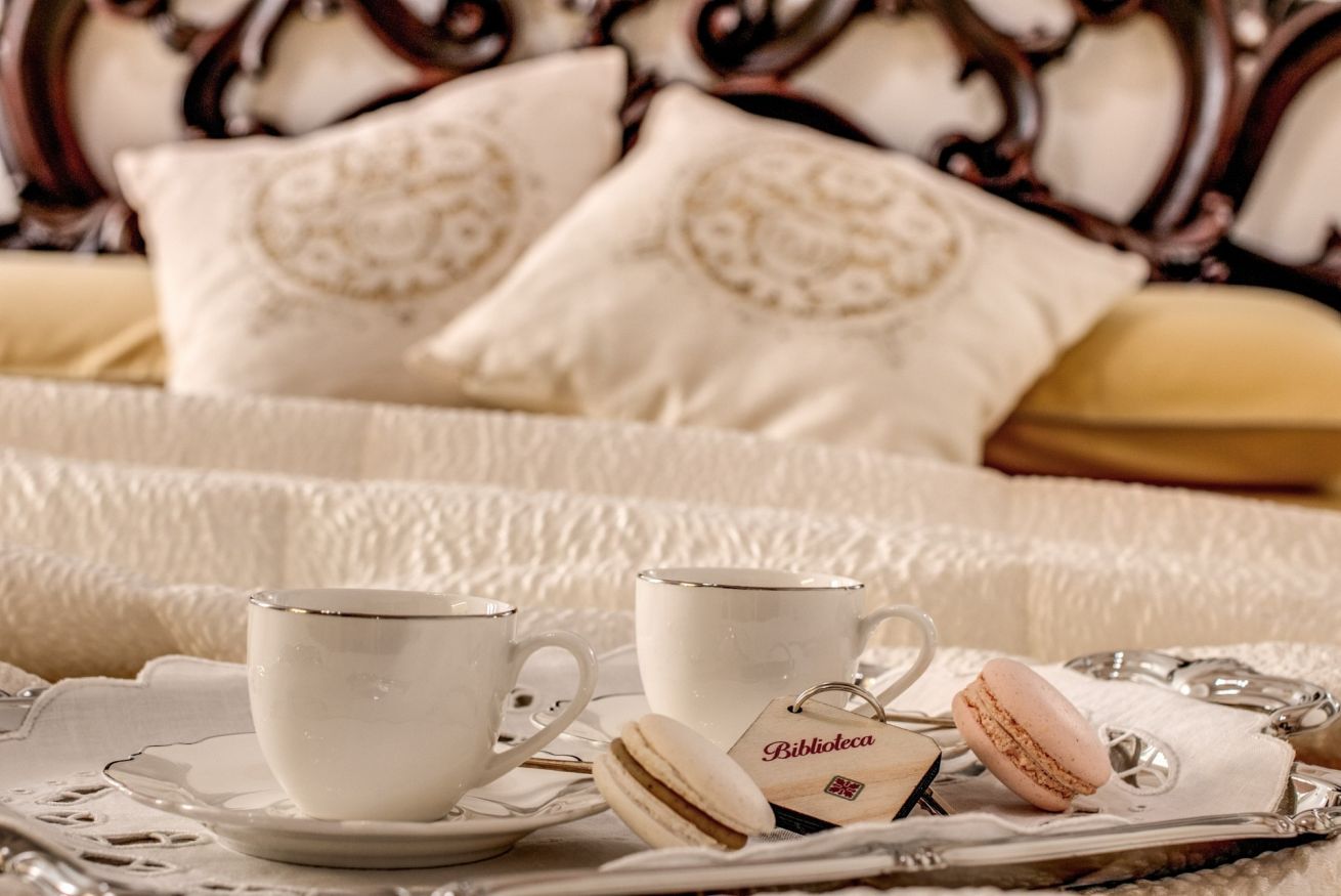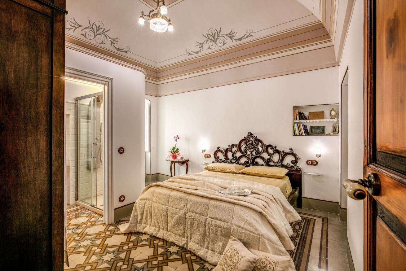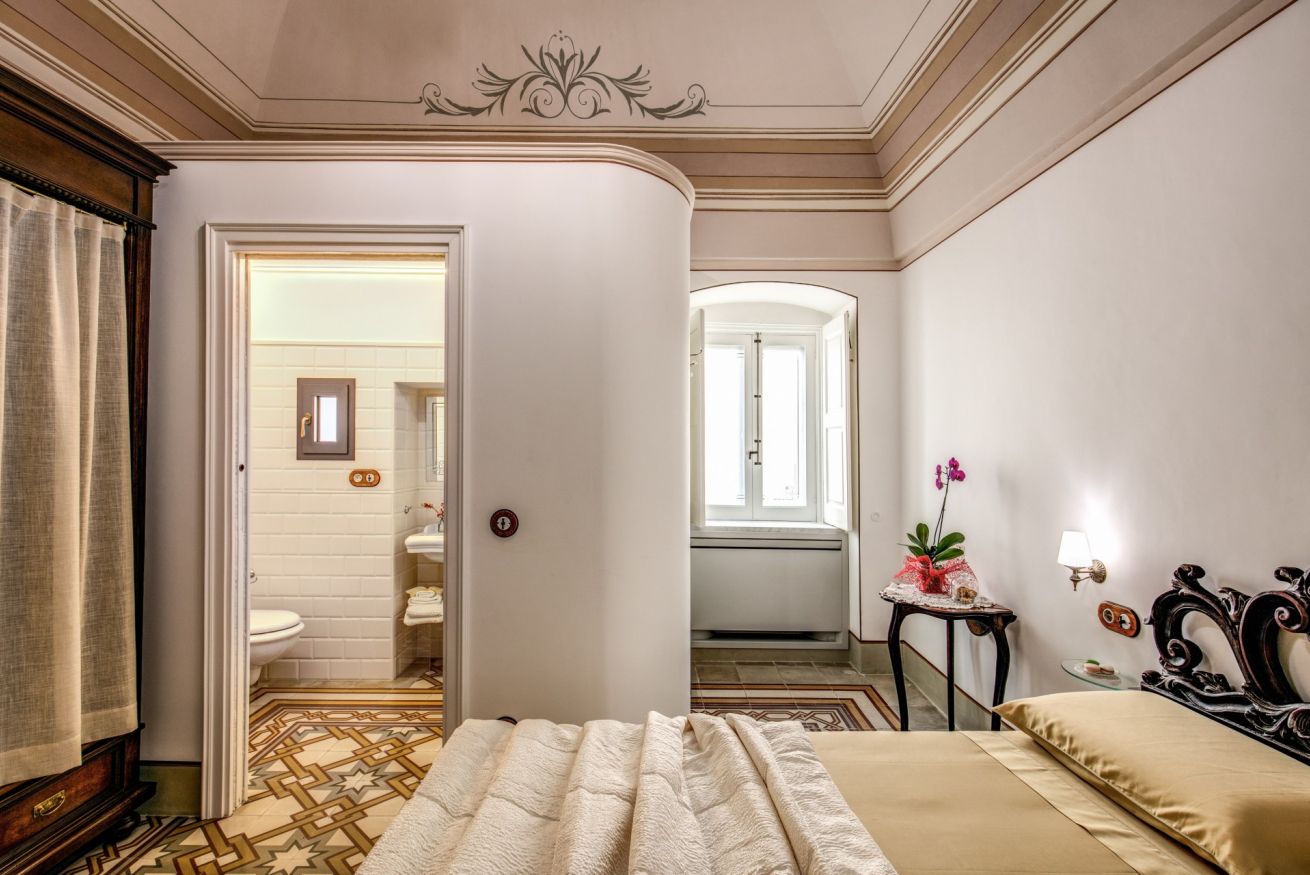 lettura ed alla conservazione di preziosi volumi, alcuni di essi tuttora conservati in una teca nella stanza, a memoria della funzione educativa del libro e della lettura. La camera ha un alto soffitto decorato con fregi stilizzati e un antico pavimento in cementine d’epoca a motivi geometrici.
