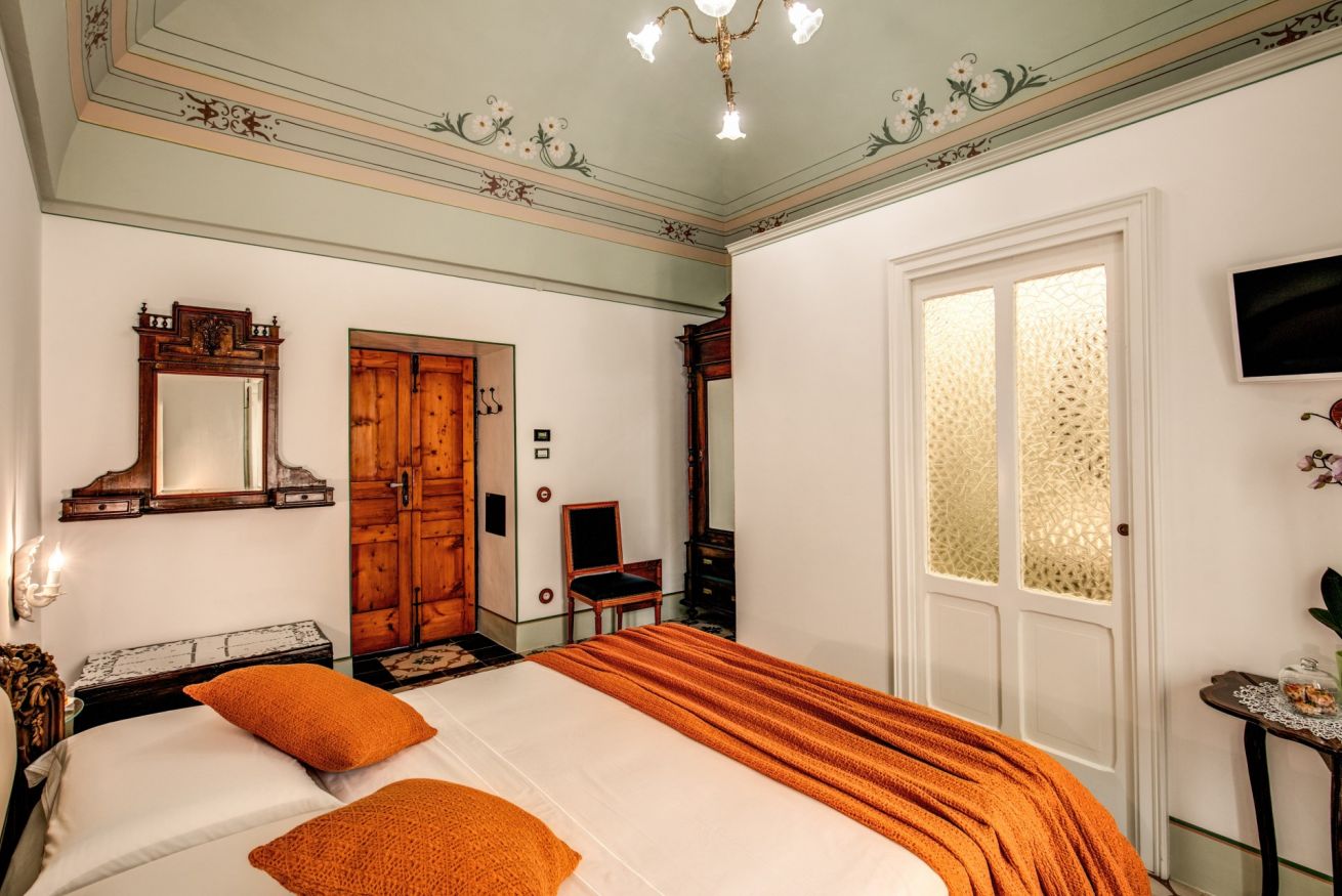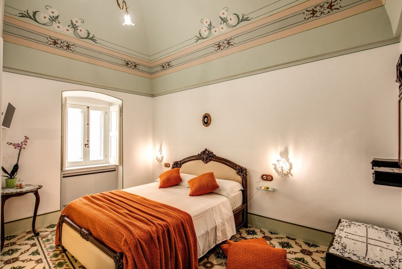 L’originaria camera da letto dei padroni di casa perpetua ancora oggi la sua funzione di accoglienza e di luogo dedito al riposo. La stanza è caratterizzata dall’alto soffitto decorato con fregi e margherite e dal pavimento di cementine d’epoca, a motivo floreale stilizzato.